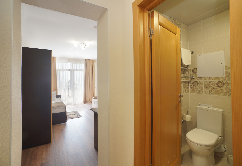 Площадь номера - 25 кв.м. 1 комната. 1 осн. место. В номере: телевизор; холодильник; балкон; кондиционер; душ; фен; электрочайник; халаты; тапочки; 1,5-спальная кровать; кресло-кровать; санузел. 1 доп. место