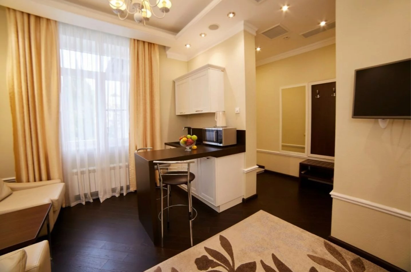 Современно оснащенный номер повышенной комфортности для гостей, любящих комфорт и уют. В номере: спальня, гостиная, гардеробная, мини-кухня. Из окон открывается вид на парковую зону.
