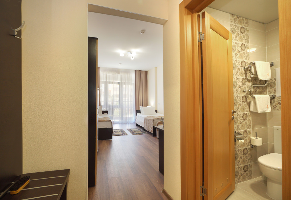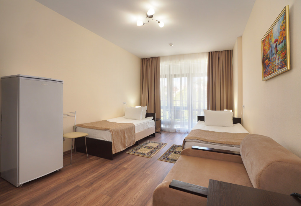 Площадь номера - 25 кв.м. 1 комната. 2 осн. места. В номере: телевизор; холодильник; балкон; кондиционер; душ; фен; электрочайник; халаты; тапочки; 1-спальные кровати; кресло-кровать; санузел. 1 доп. место