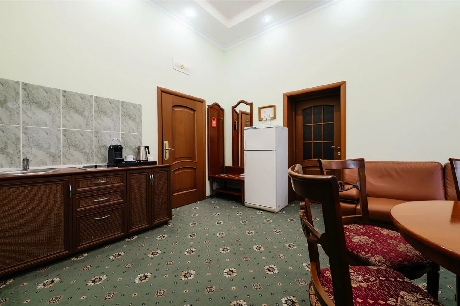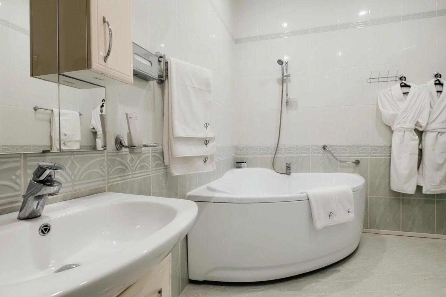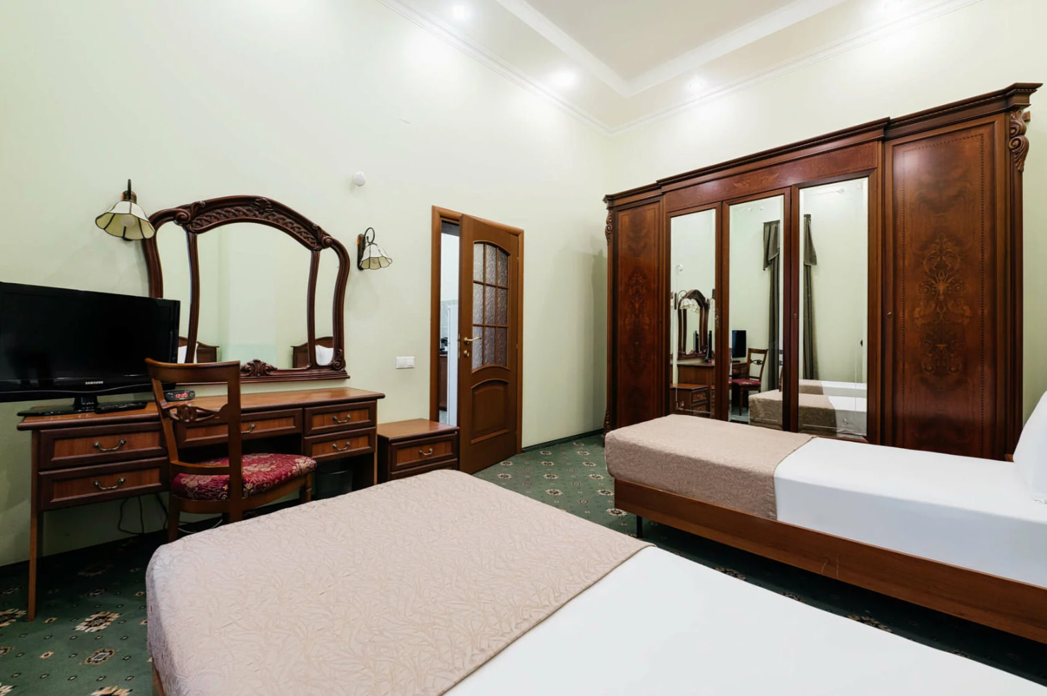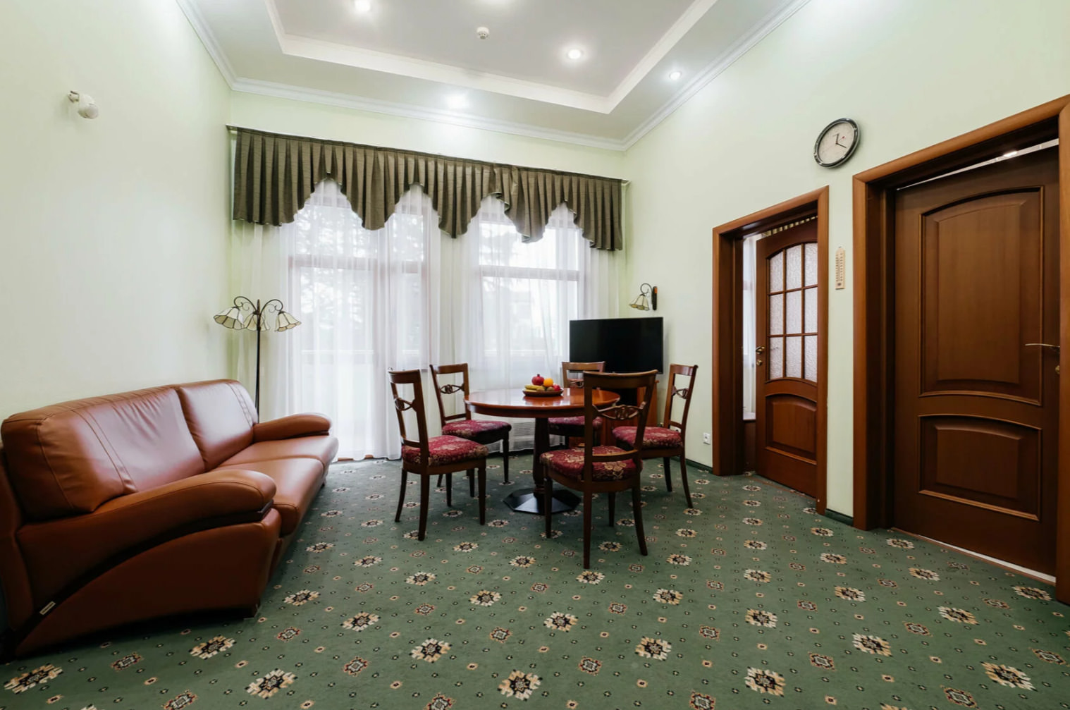Трехкомнатный номер повышенной комфортности, расположенный на четвертом этаже, с просторной гостиной, 2 спальнями, ванной комнатой и панорамным видом на горы.