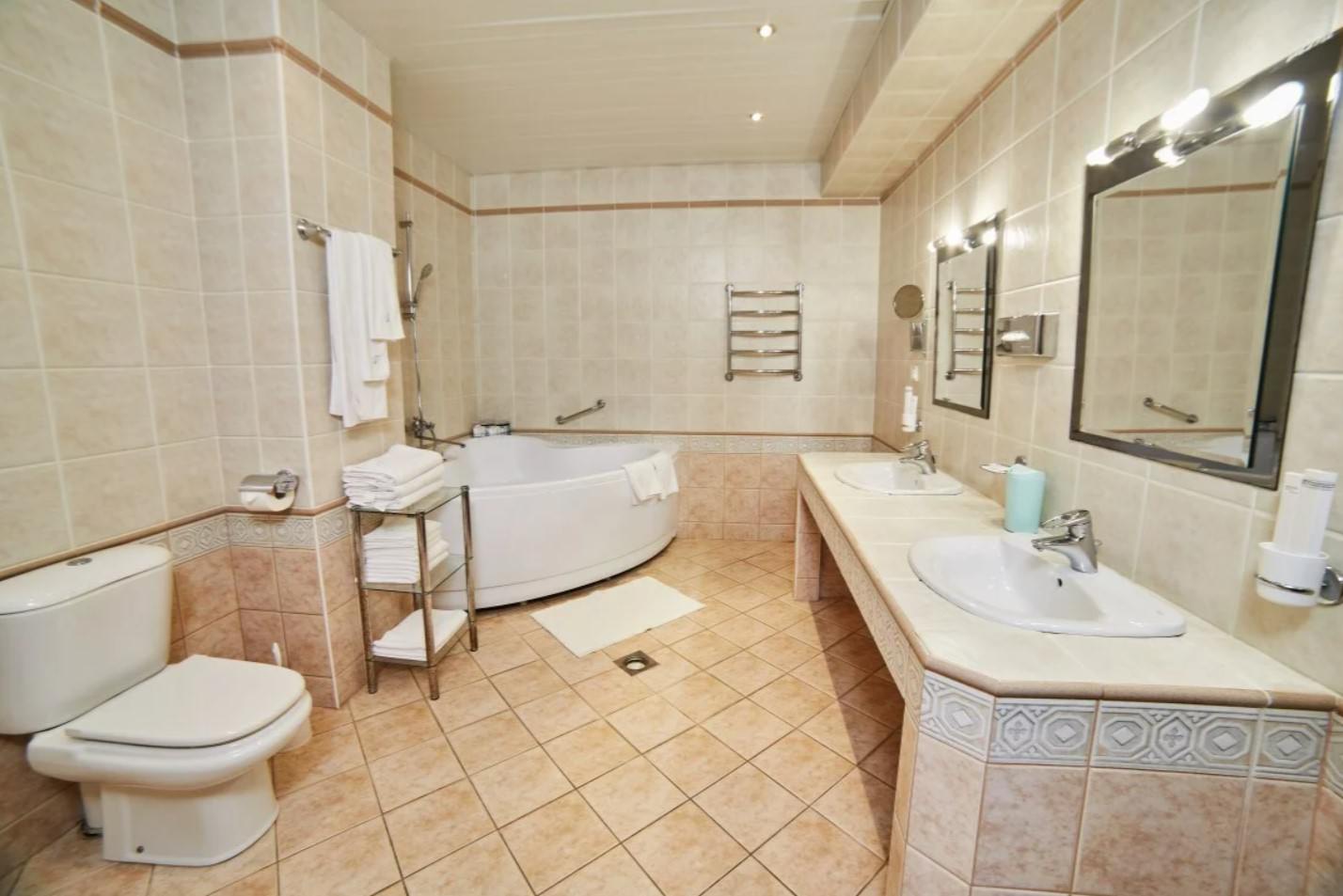 Двуспальная кровать, диваны и кресла отвечают высоким требованиям комфорта. Тумбы, зеркало, стол и шкаф отлично сочетаются с остальным интерьером. Дополнительным преимуществом номера является наличие биде и утюга.