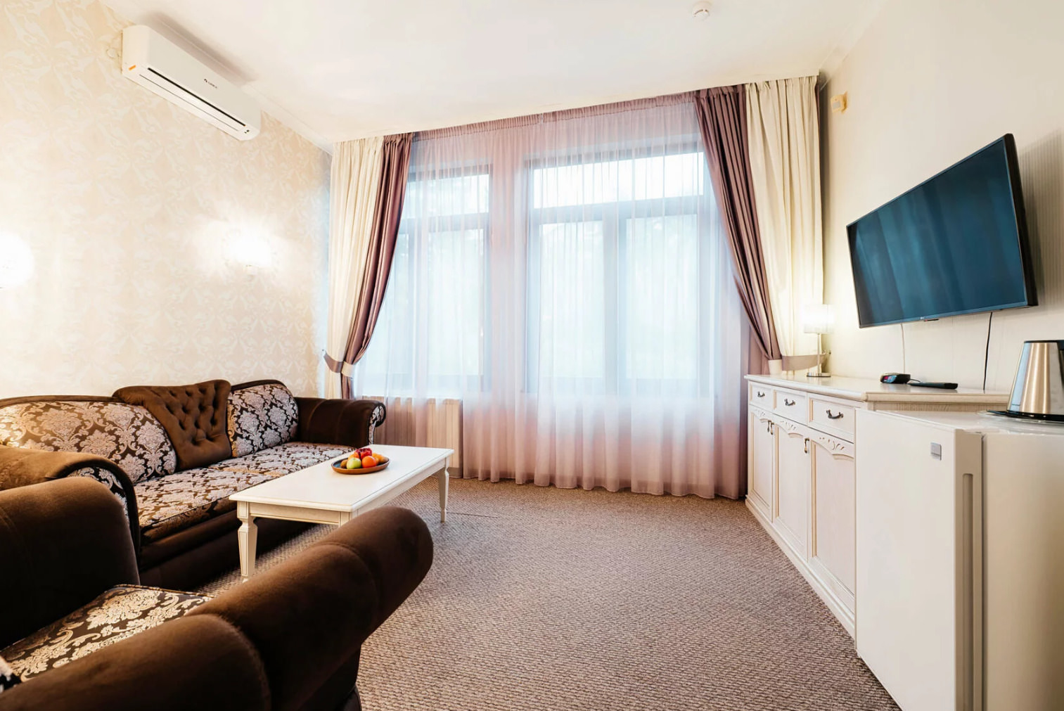 Корпус 1 Просторный двухкомнатный номер с уютной спальней и гостиной, в котором есть все для комфортного проживания и отдыха. Красивый вид из окон на горы.
