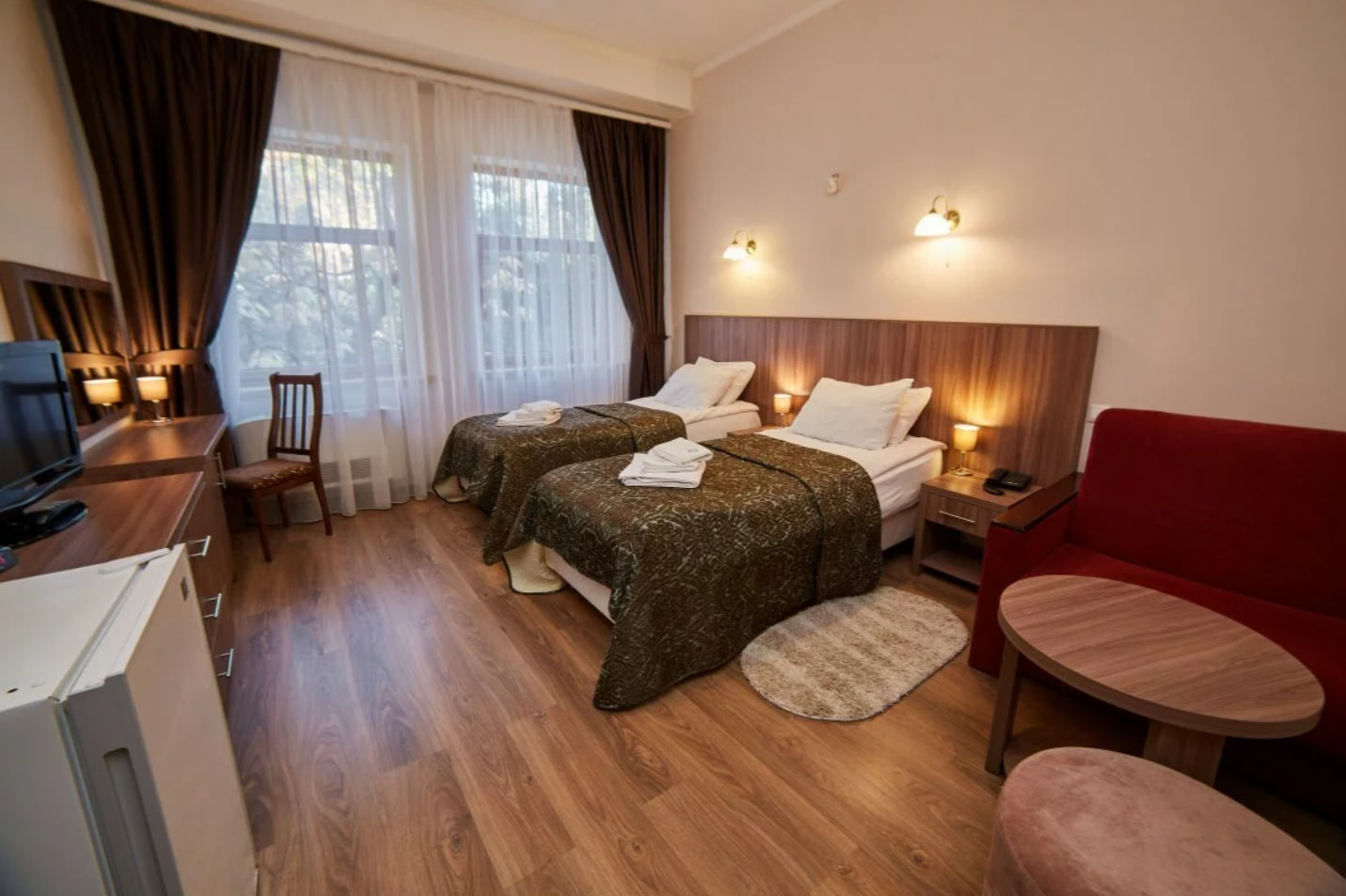 Уютный номер для спокойного отдыха и сна. Из окон открывается вид на горы. В номере есть все необходимое для комфортного проживания и отдыха